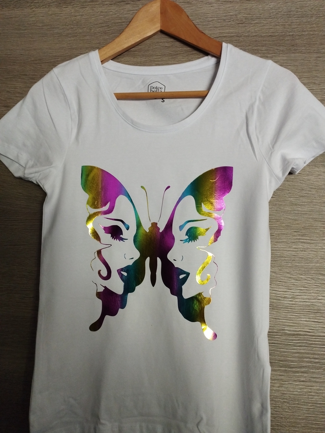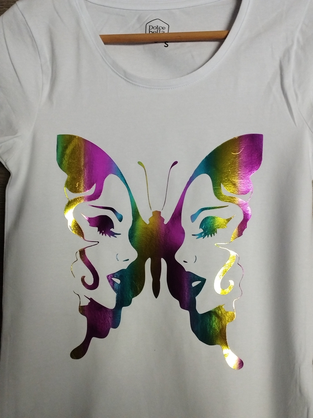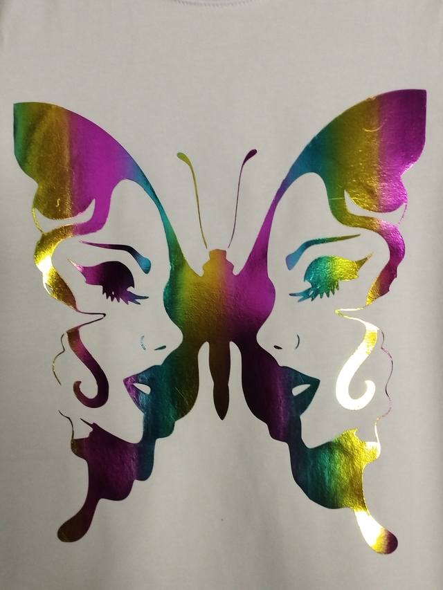 Tee-shirt blanc - Femme - floqué d'un visage papillon en flex holographique